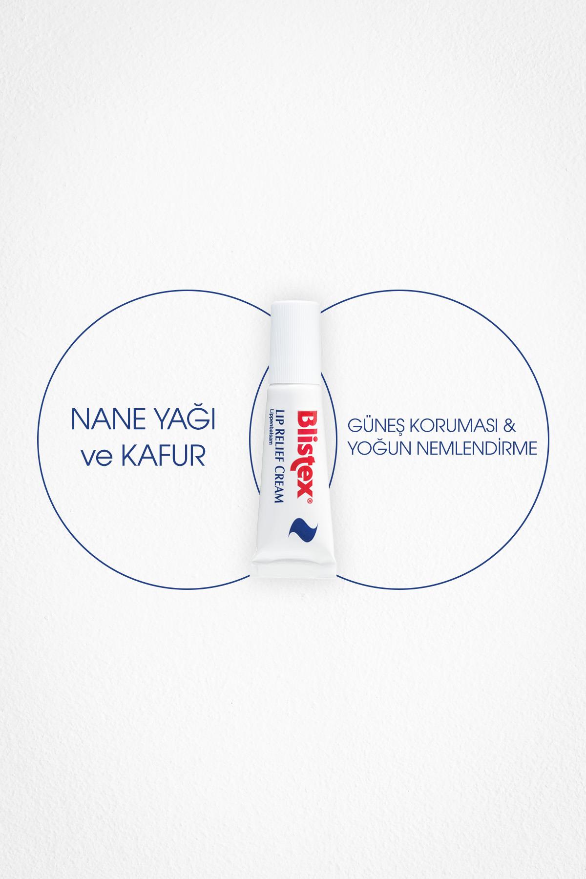 Blistex Lip relief cream, içerdiği nane yağı, kafur ve kekik yağından elde edilen içerikler ile kuru dudakları kısa sürede nemlendirerek raharlamasını destekler. Dudakların doğal koruma kalkanını onararak bakımlı ve canlı görünmesine yardımcı olur. SPF15 özelliği ile dudaklarınızı güneş ışınlarının zararlı etkilerinden korumaya yardımmcı olur. Kullanım Şekli: Dudaklarınıza ihtiyaç duydukça ve özellikle güneşe, soğuğa veya rüzgara çıkmadan önce uygulayınız. Bu hava koşullarına uzun süre maruz kalacaksanız, düzenli aralıklarla uygulamayı tekrarlayınız. Blistex Lip Relief cream dermatolojik olarak test edilmiştir.Uyarılar: Harici kullanım içindir. 3 yaşın altındaki çocukların kullanımına uygun değildir. Boyut 6 ml